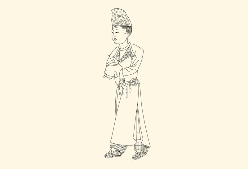 盛唐时期,陕西西安南郊出土韦顼墓石椁装饰画。图中少妇头戴胡帽,身着领袖窄小的翻领胡服,这是天宝年间流行的妇女时装样式。