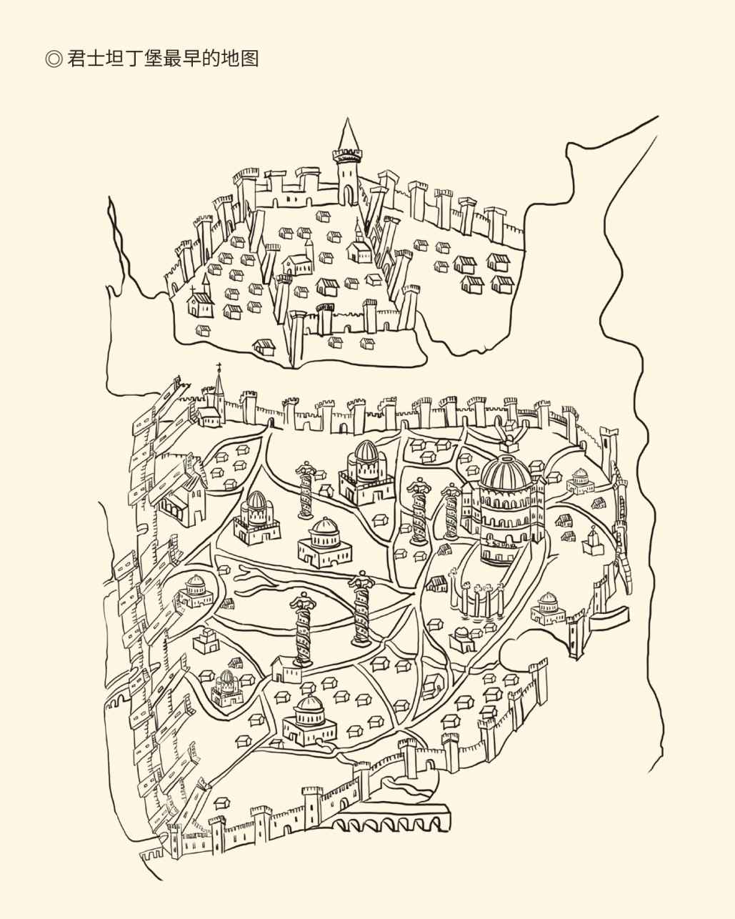据意大利制图者克里斯托弗·保德尔门特1420年制作的羊皮纸墨水画。君士坦丁堡的主要特征均清晰可见:护城河、双层城墙、大广场,还有皇家记功柱、圣索菲亚大教堂,堪称最早的君士坦丁堡实用地图。