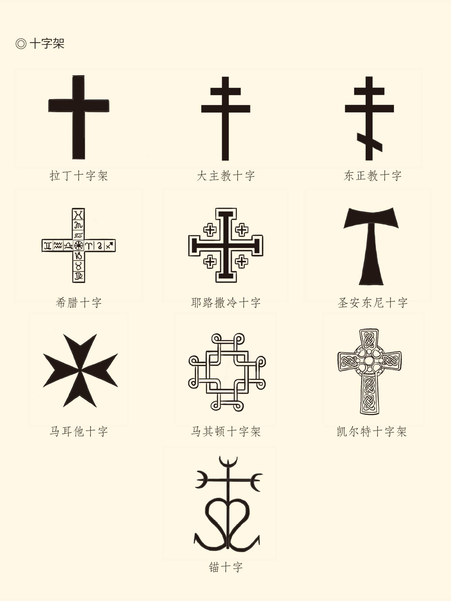 十字架本是用来处死战俘、罪犯的刑具。基督教传说中耶稣遭陷害,被钉死在十字架上,三日后复活。从此,十字架成为基督教徒信仰的标志。不同的基督教派系,使用的十字架也不尽相同,据说有三百种之多。