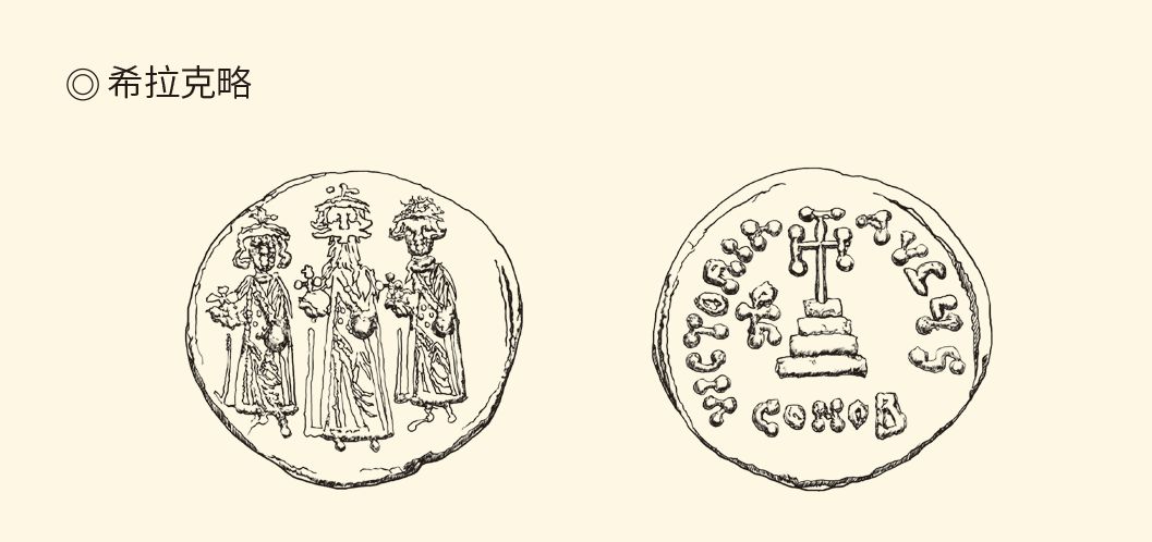 拜占庭索利多金币,直径20毫米,重4.45克。正面是希拉克略一世及长子希拉克略·君士坦丁、次子希拉克罗纳斯戴王冠的站像。背面有十字架及基督符。英勇的希拉克略一世35岁时即位。