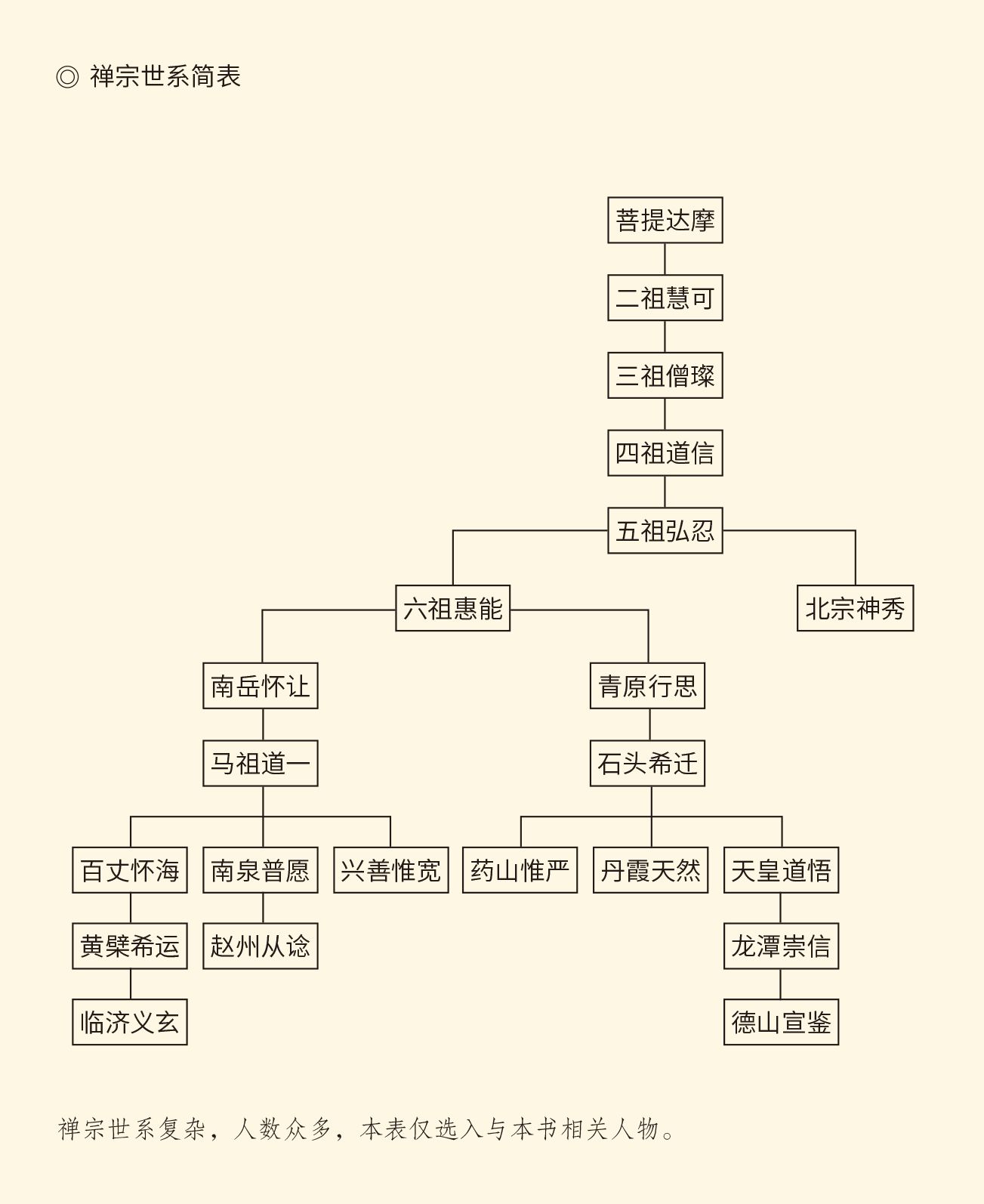 事实上,六祖之后,法嗣就不再一脉单传,甚至还各自开宗立派。也不称祖,称世,包括四祖和五祖旁出的(见上页表,后面提到的人物关系亦见此表)。可以说,从菩提达摩到六祖惠能,便相当于阿拉伯人的四大哈里发,北宗和南宗则相当于伍麦叶和阿巴斯王朝。只不过,禅宗的伍麦叶和阿巴斯是同时并存,至少开始的时候是这样。