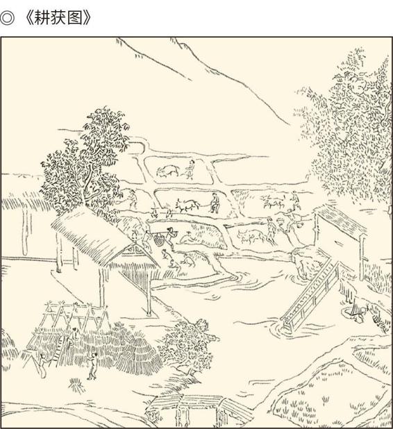 据故宫博物院《宋人画册》扇面画《耕获图》。原图为绢本,淡设色,纵24.8厘米,横25.7厘米,签题为杨威。此图描绘了宋代江南田园风光。