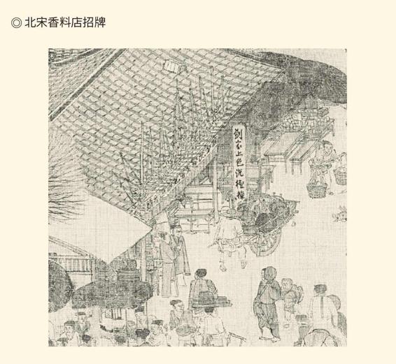 此图上的广告招牌为“刘家上色沉檀拣香”,出自《清明上河图》。宋代民间商业繁荣,店铺广告也随处可见。