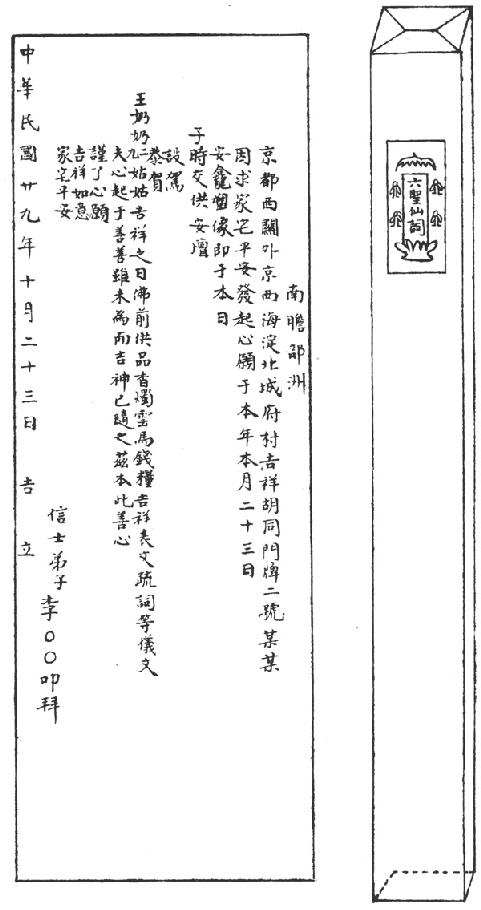 在大龛的左边,放着“安龛表”。“表”的构造,外面是一个黄色素封筒,折叠矗立成长方形,长约四尺,宽约五寸,中间所粘的花签为红色,上面印着荷叶帽,下面莲花托,两旁分立三四个仙人,中间写着“六圣仙词”,这是李香头此辈的“堂号”(师父给取的“堂号”),因为李香头在本门中是第六辈,她的师父的“堂号”叫做“五圣仙境”。堂号由写表文的人同时填写。下面是表疏封筒和安龛表文的样子: