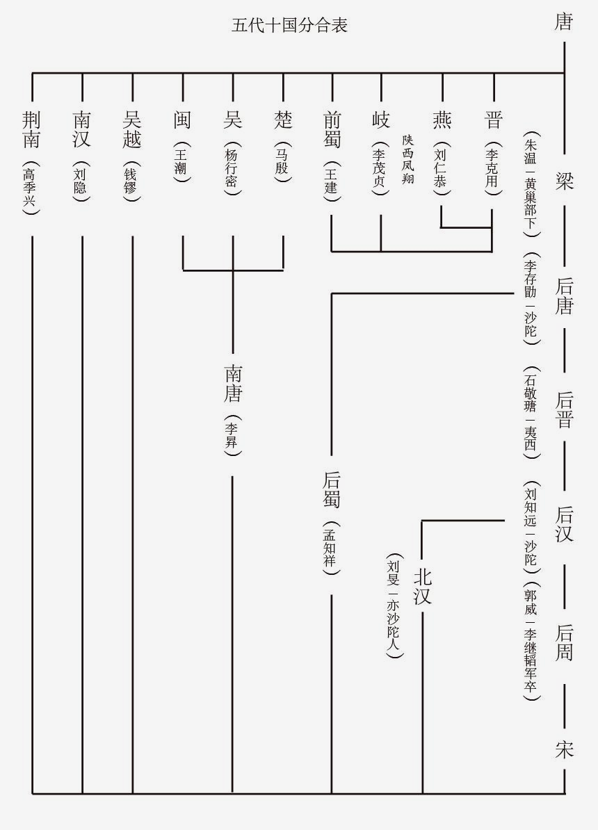 四、五代均在黄河流域,十国【除北汉。】均在长江以南。五代名义上虽上承唐,下启宋,号为王室递禅之正统,其实前后五代,共止五十四年,而已有八姓、十三君。就其开国之君而言,三位是胡人,【唐、晋、汉。北汉亦是胡人。】一位是流寇,【梁。】一位是募兵,【周。】正可说明那时的北方中国,已到了最不象样的时代。而南方九国,【十国,除北汉,只九国。】比较气运长,【其中过半数以上,每一国之年代,皆超过五代之全时期;其少数亦超过五代全时期之一半。】文物隆,还有一个样子。自此以后,南方社会,遂渐渐跨驾到北方社会的上面去。【此和南北朝又不同,尤著者,如吴徐知诰之轻赋恤民,越钱镠之大兴水利,江、浙一带,至宋遂为乐土。又如南汉刘岩所用刺史无武人,皆北方所万不能及也。而南唐文物,尤为一时之冠,宋太祖建隆元年,有户九十六万余,嗣平荆南、湖南、蜀、广南、江南,得户一百六十万。蜀五十余万,江南六十余万,即两地户数己超过中原矣。此亦与三国、南北朝相异也。】
