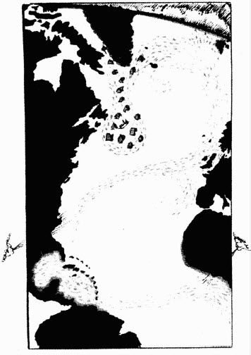 墨西哥湾流从墨西哥湾出发,沿着美洲东海岸一路北上,直到最终被东海岸挡住,便向东折去,开始穿越北大西洋。在纽芬兰的大浅滩附近,它与从格陵兰的冰川地区流来的拉布拉多寒流汇合。拉布拉多水温冰冷,而墨西哥湾流则温暖而好客,这两股巨流的突然混合产生了茫茫大雾,使这一片水域因此恶名远扬。还有洋面上漂浮着大量的冰山,在过去50年的航海史上,它们也扮演着让人恐惧和厌恶的角色。这些冰山是被夏日的骄阳从格陵兰岛坚硬的冰川上切割下来的(这个岛有90%被冰川覆盖),然后缓缓向南飘去,最后流进了墨西哥湾流和拉布拉多海流汇合所形成的巨大涡流之中。