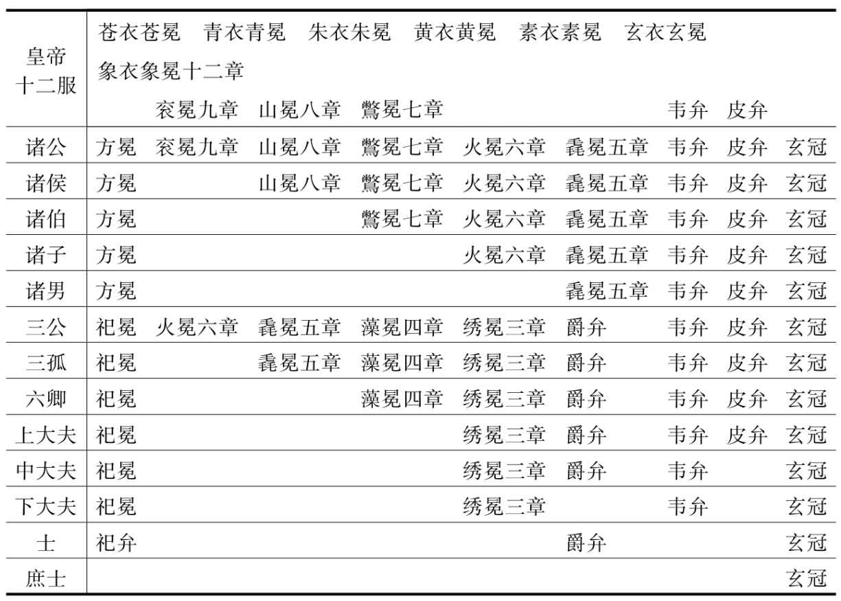 魏明帝看到高山冠跟通天冠、远游冠样子太像了,就把高山冠“毀变”为进贤冠的样子,以令君臣有别(56)。他还不准公卿在冕服上使用黼黻,以免“拟于至尊”(57)。魏晋南北朝各朝虽然沿用了很多汉式的冠类,但变化也在不断发生着。北齐的五品以上命妇,“以钿数花钗多少为品秩”,一品九钿、二品七钿、三品五钿、四品三钿、五品一钿(58)。可见就连官僚家属的服饰,也严格以官品为准,远比汉代细密了(59)。北周利用《周礼》“六冕”实行冠服大复古,创造了一套极复杂的等级冕服。兹依《隋书》卷十一《礼仪志六》,将北周冕服制表如下:
