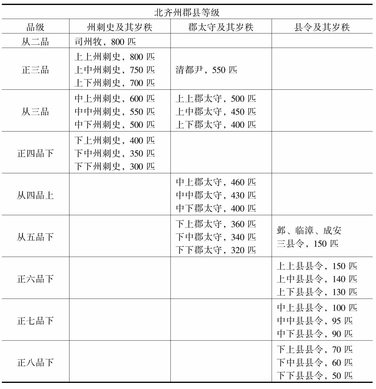一般来说,各郡县的户口、幅员、地理位置及经济条件,都有很大差异,所以地方官的等级管理,比中央官要复杂一些。对这问题,历代王朝的处理不一。梁武帝在十八班外另行制定郡守十班、县七班,而州有六等,是一种做法。北齐刺史、太守、县令都各有上上到下下九等,其俸禄、白直及所配置的属官,均有细密的规定(37)。参看下表: