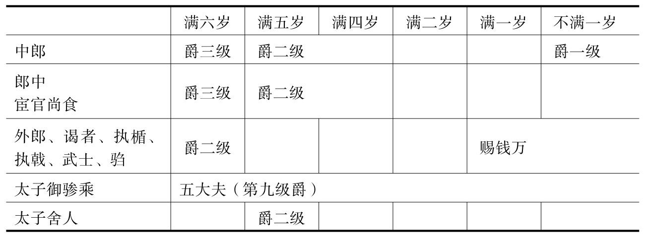 汉惠帝诏中的爵赏部分,“赐民爵一级”可置不论,其余内容则涉及三点:一、中郎等官的晋爵和赏钱;二、“给丧事者”的赏钱;三、“视作斥土者”的赏钱。后两项针对的是葬礼上承担了不同任务的同一类人,虽有赐钱、赐金之别,实不妨等量齐观。从本文角度,这三项恩遇实际只面向两类人:一、中郎、郎中、外郎、宦官尚食、谒者、执楯、执戟、武士、驺、太子御骖乘、太子舍人;二、二千石至佐史等官吏,及将军。