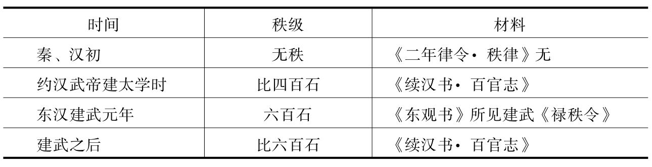 若从建武《禄秩令》看,东汉初博士似乎一度是正秩六百石。那么《续汉书·百官志三》“博士十四人,比六百石”的“比六百石”,应是建武之后的博士秩级。“博士十四人”即今文十四博士体制,王国维认为始于东汉之初(6),也有人认为始于西汉成帝之时(7)。这问题无关宏旨,就不多纠缠了。