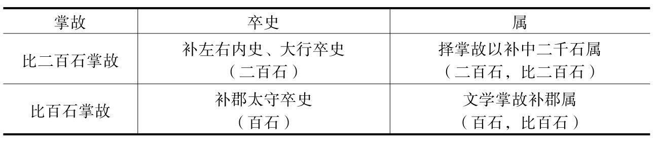 第三、我们来看掌故的分等与秩级。从“请选择其秩比二百石以上……比百石以下”与“择掌故以补中二千石属,文学掌故补郡属”两句看来,掌故是分为两等的,一等秩比二百石,一等秩比百石。同时其所补官也有两种,一是卒史,一是属。下面把我的一己之见列为下表: