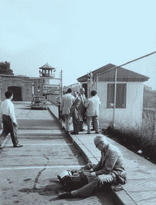 1951年,罗森堡夫妇被拘禁期间,监狱外有苦苦守候的媒体,图中一位记者正用打字机赶稿