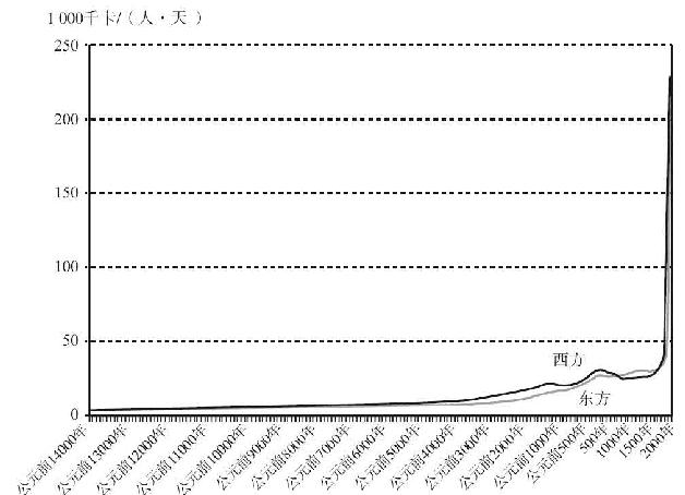 图2.4 公元前14000~公元2000年东方和西方的能量获取情况(线性标尺)