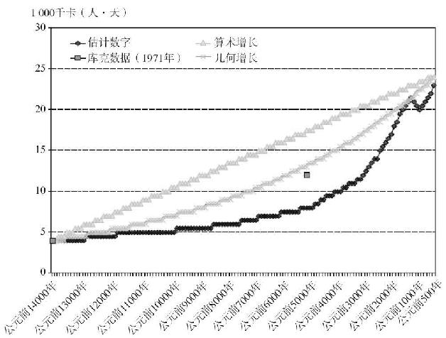 公元前14000~前10800年,能量获取水平也增长了,但极其缓慢。像新仙女木期前的阿布胡赖拉这样的定居点,相比于像欧哈罗这样的冰期晚期的考古遗址,人们获取的能量似乎更多。我猜测增长大致在每人每天1 000千卡,从每人每天4 000千卡增至5 000千卡(即3 200年间增长了25%,平均每年增长0.007%)。我这样假设并没有确凿的根据。房屋面积和精致程度、食物准备的复杂程度和物质文化的扩展程度的增长,也许只代表每人每天500千卡的增长(即12.5%的增长率);也许能代表每人每天2 000千卡的增长(即50%的增长率)。虽然这两个数字都过于极端了,但即使两者中有一个比我估计的每人每天1 000千卡更接近于现实,公元前14000~前10800年的变化量仍然非常小,假设公元前10800年时的能量获取水平为每人每天4 500千卡,或者每人每天6 000千卡,而不是每人每天5 000千卡,对于随后的计算的影响都微乎其微。