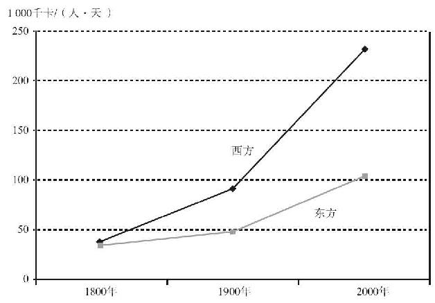 图3.21 1800~2000年东方和西方的能量获取情况