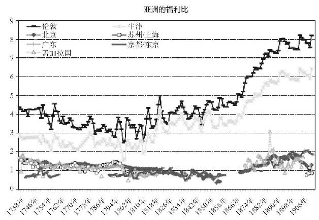 图3.20 公元1738~1918年欧洲和亚洲实际工资
