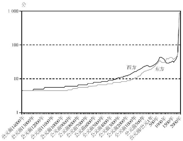 图7.1 公元前14000~公元2000年东方和西方的社会发展分数(以对数-线性标尺标绘)