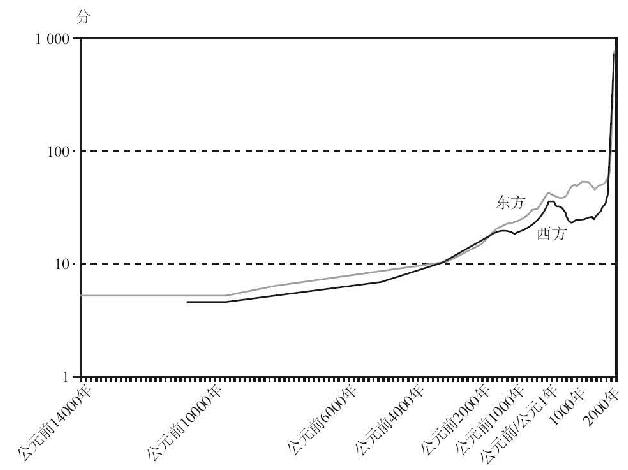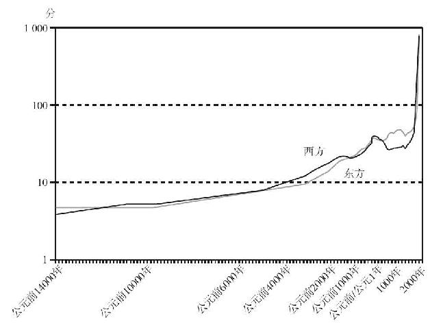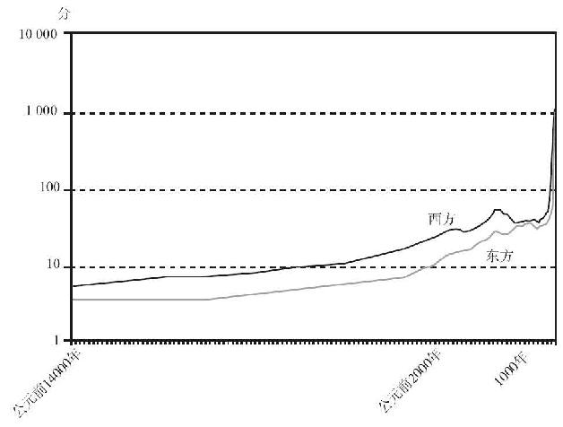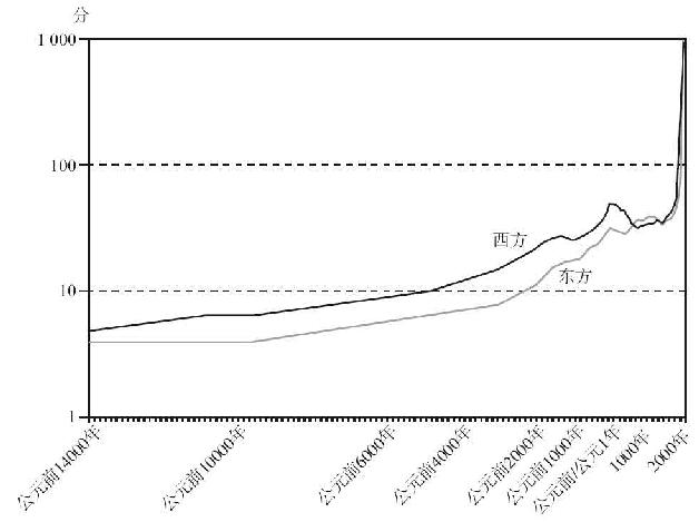 图7.3 公元前14000~公元2000年东方和西方的社会发展分数(以对数-线性标尺标绘,将所有西方的分数降低10%,将所有东方的分数提高10%)