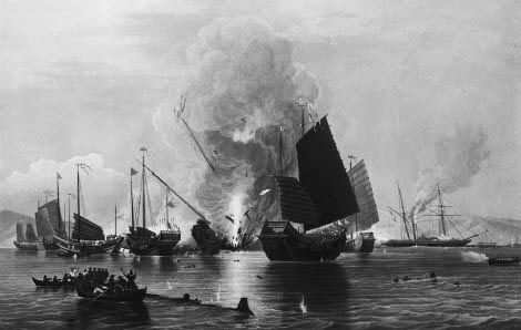 图A-2 并非最辉煌的时刻:1842年,英国舰船炸毁长江上的中国战船。图中最右端是“复仇女神”号,世界上第一艘铁甲战舰