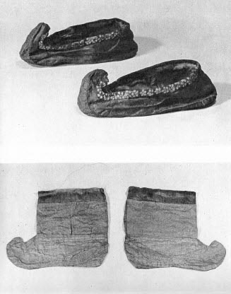 关于裹脚的最早考古依据是在黄升以及周夫人的墓中发现的,她们分别死于1243年和1274年。她们的脚上都裹着6英尺长的裹脚布,穿着丝绸鞋,鞋头向上翘(见图8-2)。周夫人的骨骼保存完好,可以看到她那畸形的脚:她的8个小脚趾头扭曲在脚掌下,两个大脚趾头向前伸着,使得这双纤细的脚能够穿进她那又小又尖的鞋子。