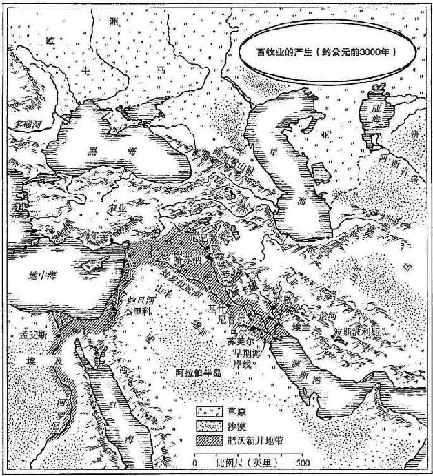 因此,一种独特的游牧生活方式出现了,它熟悉农业,但又轻视农业。相似的环境也存在于山区南面,尽管那里的气候更炎热和干旱,草原在阿拉伯半岛北部以弧形退化成沙漠。也是在这里,畜牧业发展成为新石器时代农业技术的变种。南部地区被驯服的动物种类不同于北部喜欢的体形庞大的牲畜。绵羊、山羊、毛驴比牛和马能更好抵御半沙漠气候固有的夏季饲料短缺,而较大的体形有助于牛和马度过北部草原寒冷的冬天。
