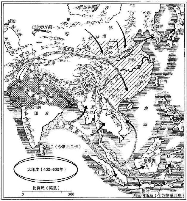 在喜马拉雅山以北,印度商人和僧侣则遇到了完全不同的情况。中国、波斯和希腊—罗马的人口都不愿意彻底抛弃他们的传统,甚至当他们情不自禁地被印度文化的某些方面所吸引时,他们被吸引的首先就是印度圣人长期实践的神秘的禁欲主义技巧。因此,只有印度文化的某些方面在文明世界其他地区扎根和繁荣,尽管印度对东南亚的影响只因当地的野蛮文化和简朴的村社而被淡化了。
