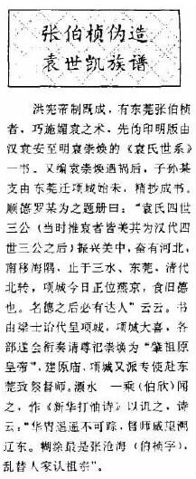 洪宪帝制既成,有东莞张伯桢者,巧施媚袁之术。先伪印明版由汉袁安至明袁崇焕的《袁氏世系》一书,又编袁崇焕遇祸后,子孙某支由东莞迁项城始末,精抄成书。顺德罗某为之题册曰:“袁氏四世三公(当时推袁者皆美其为汉代四世三公之后)振兴关中,奋有河北,南移海隅,止于三水、东莞,清代北转,项城今日正位燕京,食旧德也。名德之后必有达人”云云。书由梁士诒代呈项城,项城大喜,各部遂会衔奏请尊祀崇焕为“肇祖原皇帝”,建原庙,项城又派专使赴东莞致祭督师。漂水一城(伯欣)闻之,作《新华打油诗》注38以讥之,诗云:“华胄遥遥不可踪,督师威望溯辽东。糊涂最是张沧海(伯桢字),乱替人家认祖宗。”