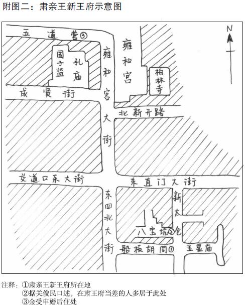 关:五道营是后搬的,这不是跟您说么,最早他十岁的时候他父亲没了他住八宝坑么,肃王府的都在东四这第一条胡同,叫八宝坑,这儿住。金受申住他叔父那儿,然后他成年了他在五道营那儿买的房,五道营那儿不是正经的四合院,也不是三合院。他在那儿成的家。