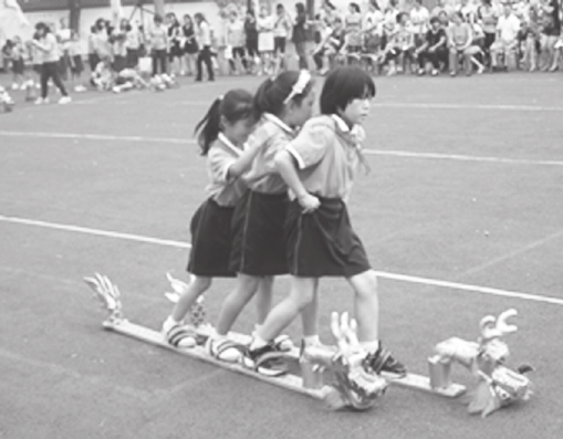 赛龙舟是端午节的重要活动,一般在水上进行,不靠水的我校,就搞旱地赛龙舟:三四人为一组参赛,可分为学生队、教师队和嘉宾队,统一计时,先到达终点者获胜。此项目通过锻炼队员的动作协调性,培养集体合作能力。