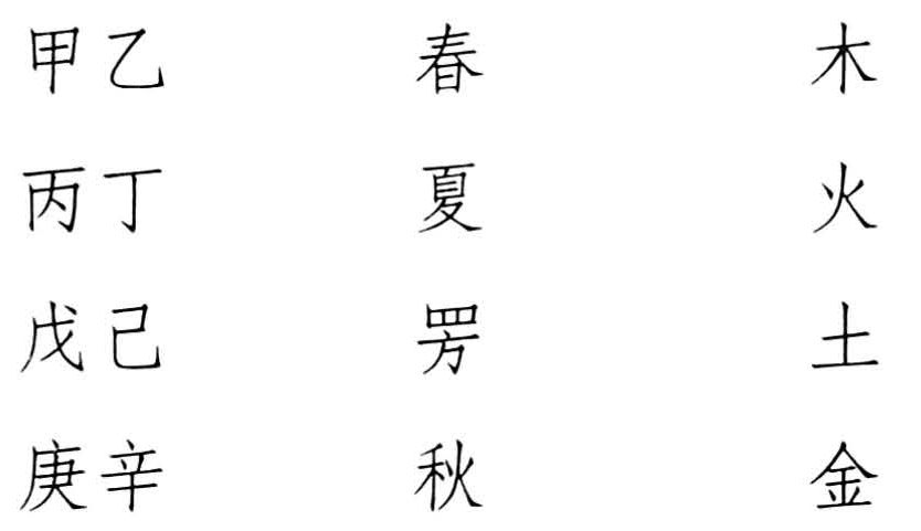 并相信五行递旺于四季:春季木旺,夏季火旺,秋季金旺,冬季水旺。于是依纪日天干之循环,春季逢天干为甲、为乙之日恰对应于木,而木是旺于春季者,则春季逢天干为甲、为乙之日即“王相”之日;夏季则轮到纪日天干为丙、为丁之日,火旺,……其余可类推。至于戊己土旺,则是每季抽出十八日,硬与五行相配,对应于土,并为之造出一个怪字“”。