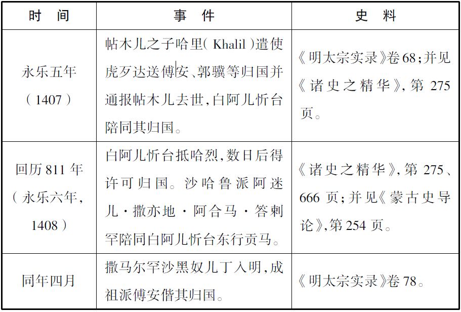 现将永乐初陈诚出使前中国与帖木儿帝国使节往来简要归纳如下: