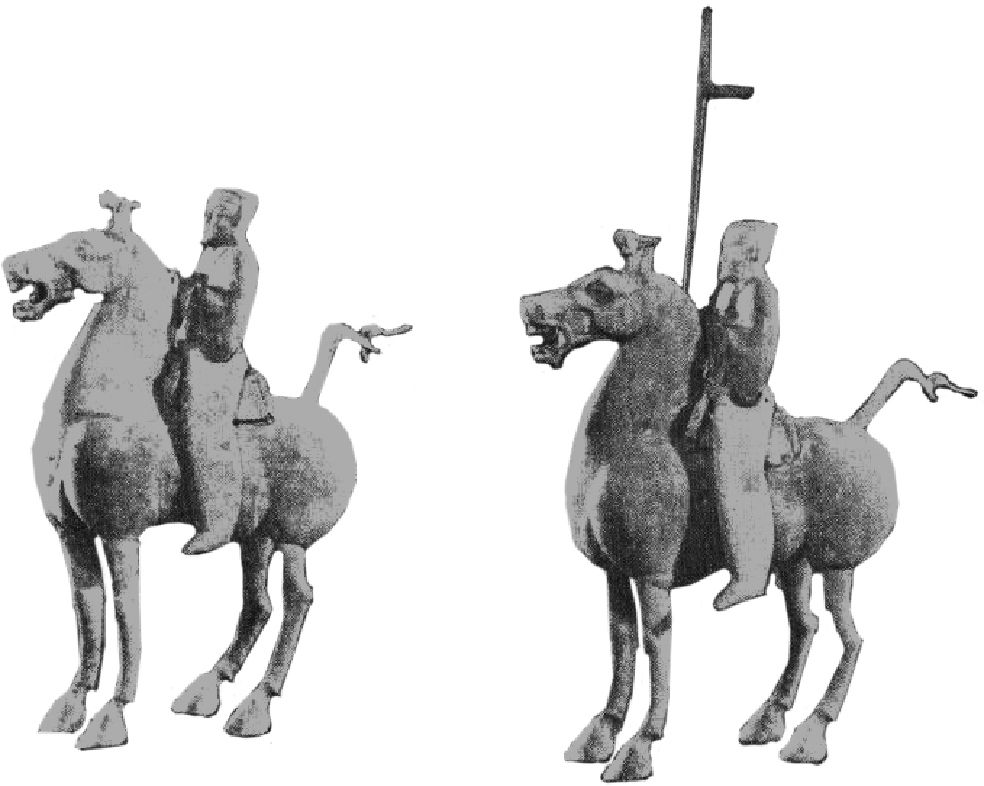 图4 长沙西晋墓的陶俑,高马鞍和单马镫组合(《长沙两晋南朝隋墓发掘报告》图版十一、十二)