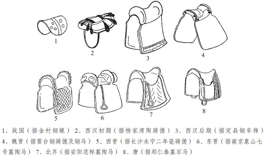 图2 战国到唐代的“马鞍具演变示意图”(杨泓:《中国古兵与美术考古论集》,第145页)