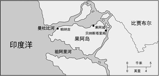 果阿城坐落于两条大河之间的肥沃岛屿之上,是印度西海岸战略位置最重要的贸易站。它位于争夺印度次大陆南部核心的两大帝国的边界:北面是穆斯林的比贾布尔王国,南面是它的竞争对手,印度教的毗奢耶那伽罗王公们。这两大王朝激烈地争夺果阿。在过去三十年里,该城已经三次易手。它的特殊价值与财富,源自它在马匹贸易中发挥的作用。果阿从霍尔木兹、波斯和阿拉伯半岛进口马匹,而对两国的边境战争来说,马是不可或缺的。不过在热带气候中,马很容易死亡,而且不能成功地繁育,所以需要不断补充新的马。果阿还有其他的优势。它拥有一座绝佳的深水港,不受季风的影响。该地区的土地特别肥沃,城市所在的岛屿,即提瓦迪岛或果阿岛,能够允许所有商品顺利进出,并在海关高效地收取关税。作为一个岛屿,它也意味着可以进行有效的防御。