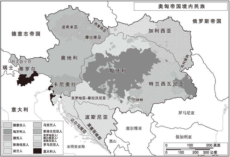奥地利的积弱不振,肇因于其境内龃龉不断且对统治当局心怀不满的诸民族。“奥地利”一词意味着清一色的德意志民族,但这个辽阔的帝国,其领土远非只有以维也纳、格拉茨(Graz)、萨尔茨堡、因斯布鲁克(Innsbruck)的说德语的核心地区。一九一三年,奥地利是欧洲第二大国(仅次于俄国),欧洲第三人口大国(次于俄国和德国)。但五千两百万奥地利人中,只有一千两百万是德意志人,问题就出在这里。一九一三年,奥地利的最大族群是斯拉夫人。这个西起瑞士边界、东抵俄国边界的君主国,有八百五十万捷克人和斯洛伐克人、五百五十万克罗地亚人和塞尔维亚人、五百万波兰人、四百万乌克兰人、一百三十万斯洛文尼亚人,斯拉夫人占奥地利人口五成;此外还有人数几乎和德意志人相当的匈牙利人(一千万),占人口一成九。