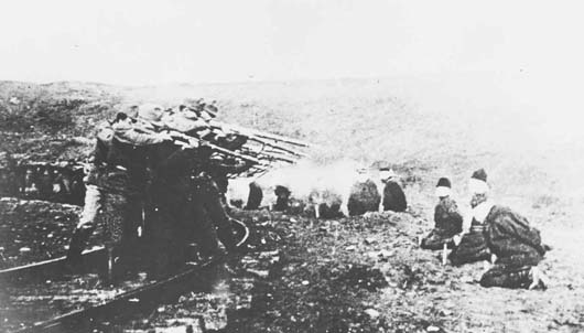 奥地利步兵射杀塞尔维亚村民。有位奥匈帝国将领在一九一四年连番目睹对塞尔维亚平民的暴行后,反感地写道:“这不是文明军队所应为。”