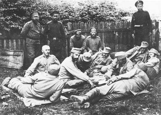 一九一五年初期时,哈布斯堡军官团已分为水火不容的两派:一派是职业军官,往往有人脉来取得远离前线、“免挨子弹”的差事;另一派是仓促动员来,在壕沟里吃苦的志愿军官。照片中这群被俘的奥匈帝国军官,看来为不用再打仗松了口气。