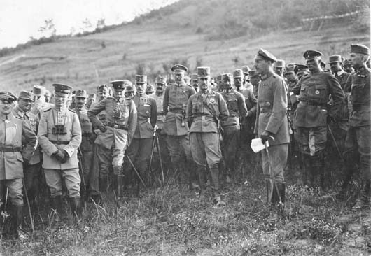 一九一五年,德国人已接管奥匈帝国的作战事务。照片中第七军军长约瑟夫大公与德国将领汉斯·冯·塞克特(Hans von Seeckt),以及两人的参谋,摄于喀尔巴阡山脉。