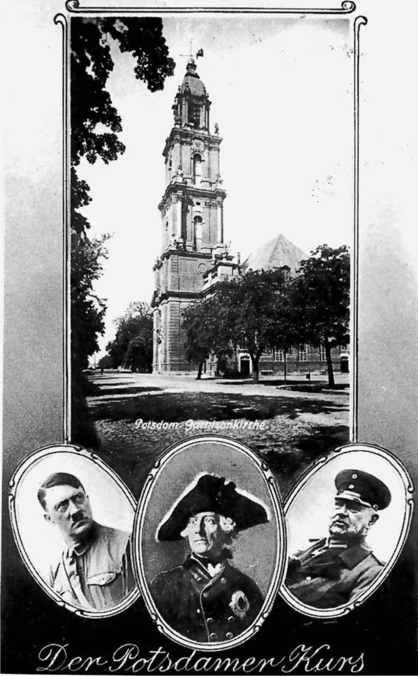 图30 庆祝“波茨坦日”为希特勒做的宣传海报, 将希特勒描绘为大政治家以及由兴登堡认可的腓特烈二世继承人。慕尼黑巴伐利亚州府档案馆藏。