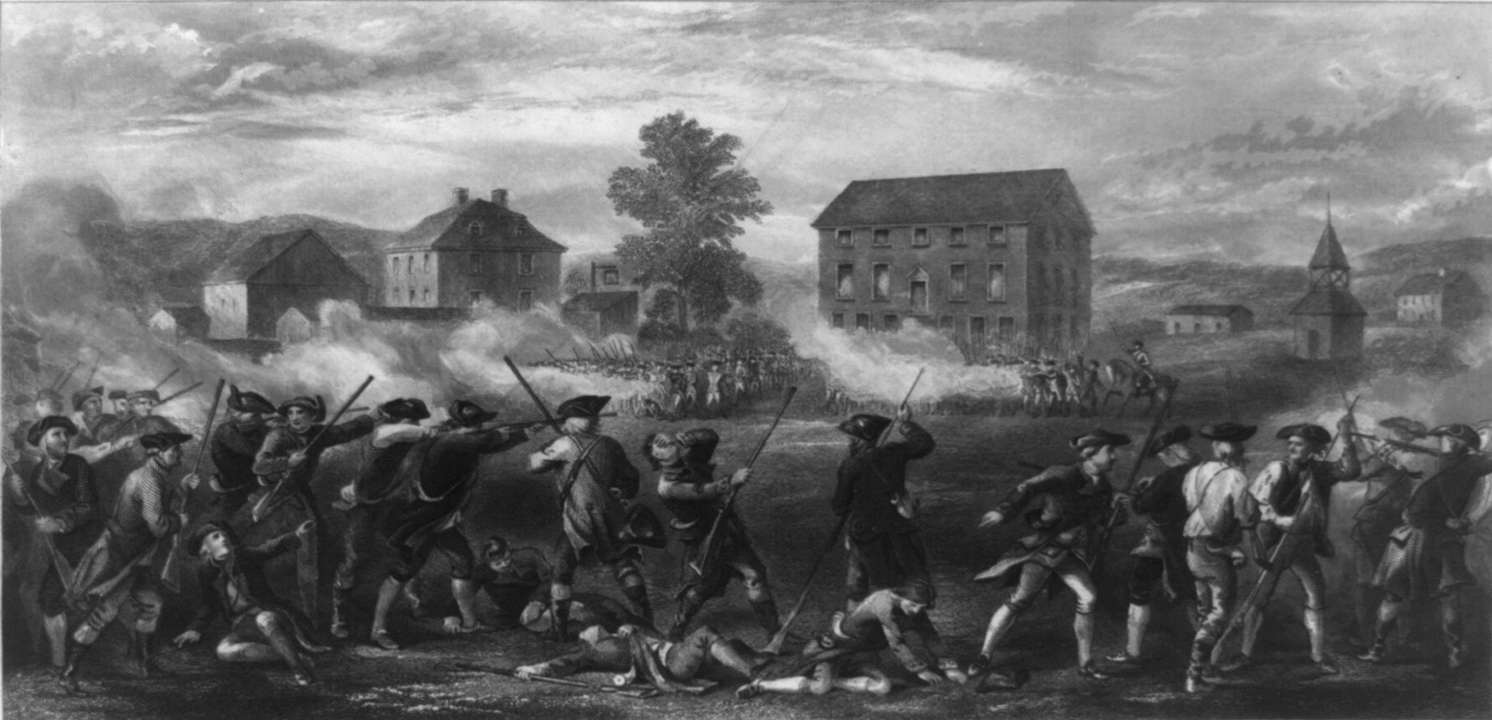 图18 1775年,英国军队在马萨诸塞州莱克星顿开枪射击一排“一分钟人”(约翰·丹尼尔斯父子,1903年)。由美国国会图书馆印刷品与照片部友情提供(LC-DIG-ppmsca-05478)。