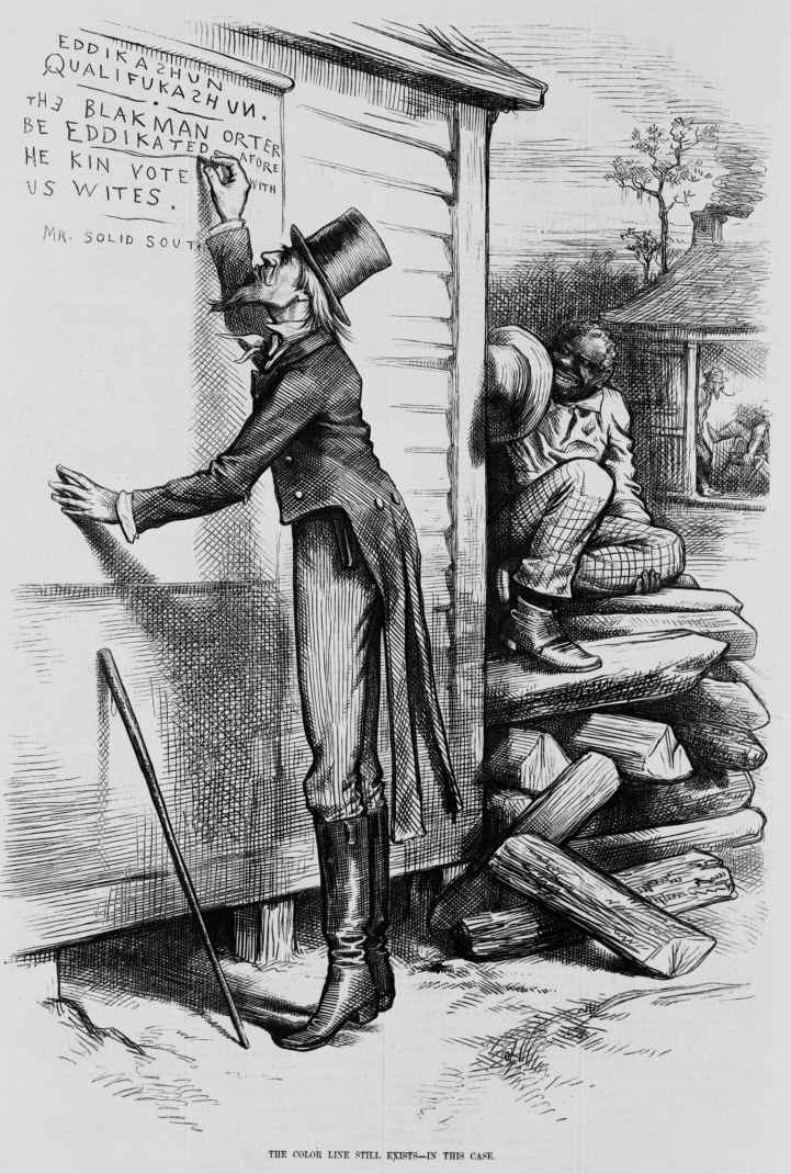 图37 《种族界限仍然存在——假若这样》(1879年)。这幅漫画出现在1879年1月18日的《哈泼斯周刊》上,漫画嘲讽的是识字测验,即旨在剥夺非裔美国人的公民选举权的南方识字测验。画中,“山姆大叔”在墙上写着“叫育呈度。黑人因该接受叫育,然后才能和美国百人一样选举,署名:南方诸州先生”。这幅漫画从某种程度上来说是超前的。19世纪80年代和90年代期间,在歧视性立法方面出现了最坚决的“退出重建”现象,而其最开始的迹象和推动力就是1883年推翻了1875年《民权法案》的民权诉讼诸案。正是1883年的裁决允许了种族隔离的继续发展。1903年,非裔美国领导人威廉·爱德华·伯格哈特·杜博伊斯在《黑人的灵魂》中指出,“20世纪的问题就是种族界限的问题”,他说的并不只是美国。到了20世纪,“种族界限”的观念变得愈加明显。“南方诸州先生”指的是在南方从共和党重建中“赎回”后民主党在该地区的选举优势。南方在这方面一直都“坚固地”挺立着,一直持续到20世纪。因而,在许多方面,这幅漫画是真正认识了墙上写着的字。由美国国会图书馆印刷品与照片部友情提供(LC-USZ62-83004)。