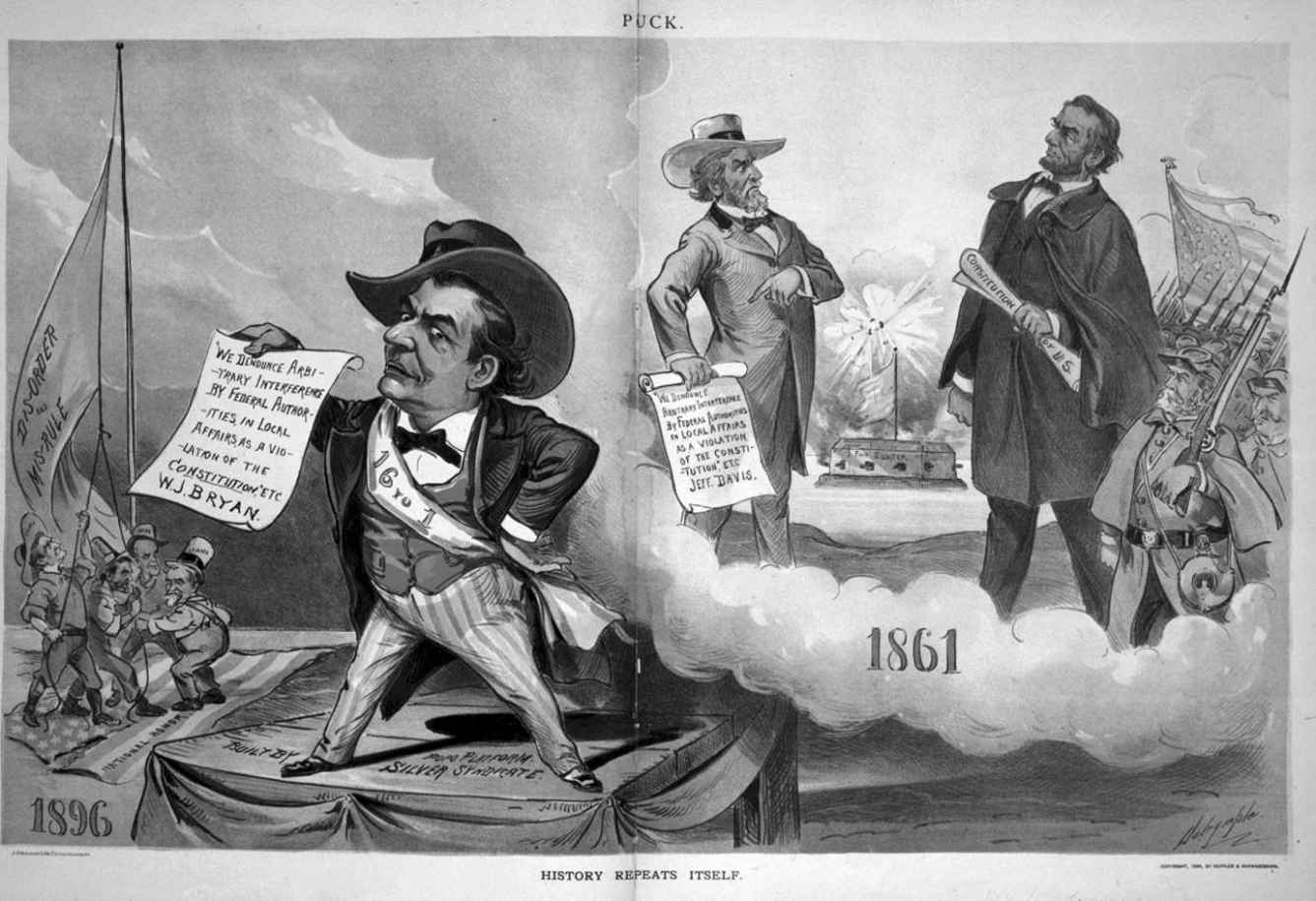 图43 《历史总会重演》(路易斯·达尔林普尔,1896年)。这幅漫画刊载于1896年10月28日的《顽童》杂志。其中描绘了威廉·詹宁斯·布赖恩的漫画形象,他的手中拿着一张纸,上面写着:“我们谴责联邦政府在地方事务上粗暴的干涉,这是一种违宪行为。”这张纸的下面有一群人,其中包括本·蒂尔曼、约翰·奥尔特盖尔德和尤金·德布斯。在他们中间升起了一面写着“混乱”和“暴政”的旗帜。被称为“干草叉”的本·蒂尔曼是南卡罗来纳州的前州长(1890—1894年),他将南卡罗来纳州从共和党的手中夺了回来,还帮助在那里建立起白人政治霸权。约翰·奥尔特盖尔德是伊利诺伊州州长和一名左翼民主党人,当时普遍认为在芝加哥举办的民主党会议上,布赖恩之所以能被提名,背后的推动力量就是奥尔特盖尔德。尤金·德布斯是美国最重要的社会主义者和联盟领袖。作为世界产业工人联盟和国际劳工联盟的发起人,他以独立身份参加了1900年的选举和1920年之前的大多数选举。在图片右侧,邦联总统杰斐逊在亚伯拉罕·林肯以及联邦部队面前拿着一张相似的纸,并以此强调布赖恩即使没有分裂美国,也对美国造成了破坏。由美国国会图书馆印刷品与照片部友情提供(LC-USZC4-4361)。
