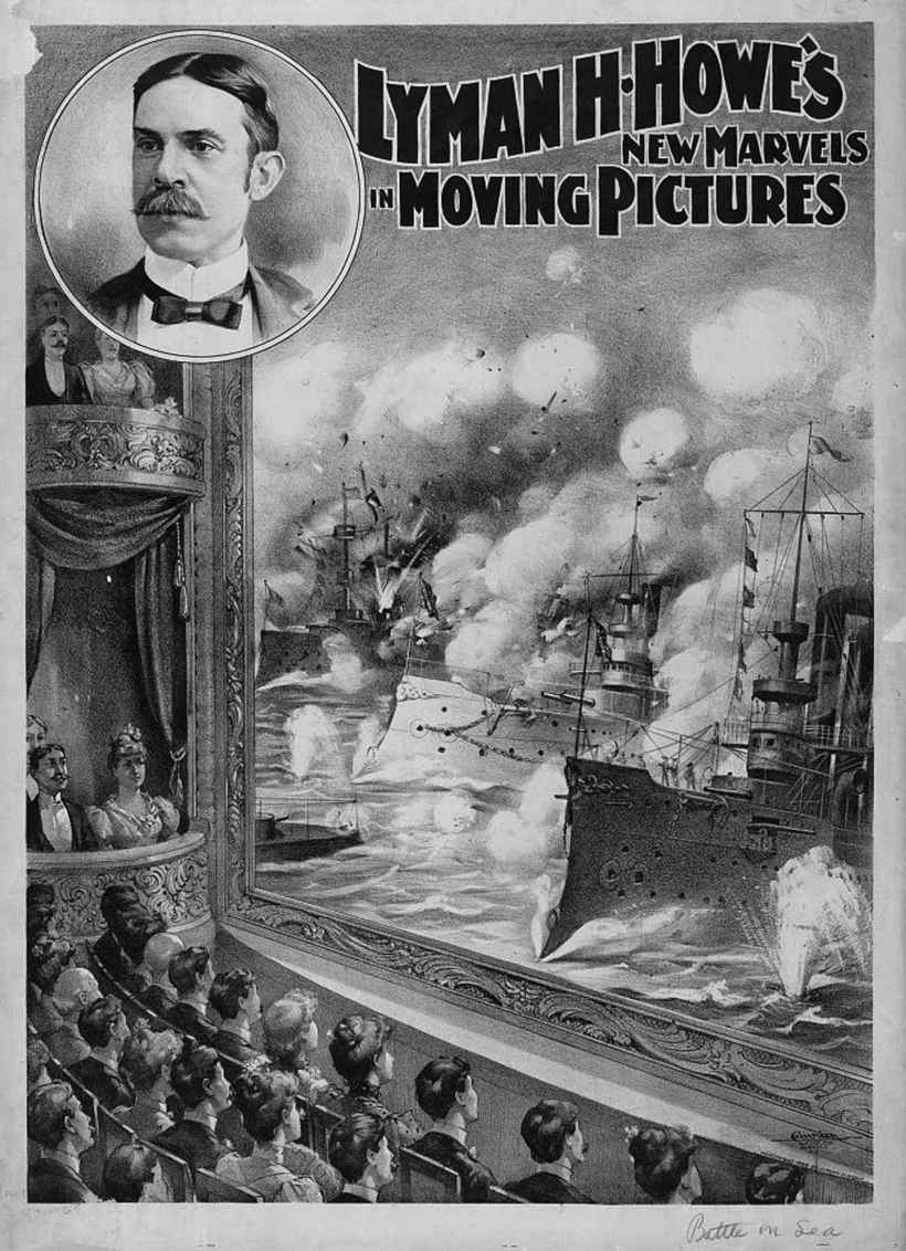 图45 《莱曼·豪在电影行业创造的新奇迹》(纽约:库里耶印刷公司,约1898年)。这张海报宣传了一家剧院将要上演一部关于美西战争海战的电影,当然,这部“电影”并不是镜头记录下海战的真正场景,而是一种原景重现,更准确地说,是一种利用电影工作室中的模型对这场海战进行的模拟。19世纪末的观众已经很熟悉这种电影,以及这种历史事件的“舞台”呈现——它已经是一种很受欢迎的娱乐,这种做法非常普遍,在任何意义上都不会被认为是一种欺骗。本质上讲,观众试图想要从这种娱乐中证实信息,而不是追求逼真的效果;这些作品的目的和效果都指向爱国主义,同时也是20—21世纪常见的、从美国视角拍摄的大量战争电影的先驱。由美国国会图书馆印刷品与照片部友情提供(LC-DIG-ppmsca-05942)。
