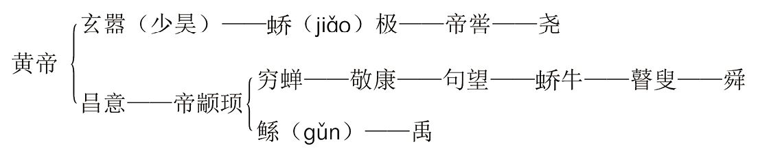 注20 据《史记·五帝本纪》和《大戴礼记·帝系姓》,五帝的系图如下。其间代数,或不足信,说颛顼以后,都出于黄帝,大约是不诬的。因为古代天子、诸侯、卿、大夫的世系,都有专记他的史官,即《周官》小史之职