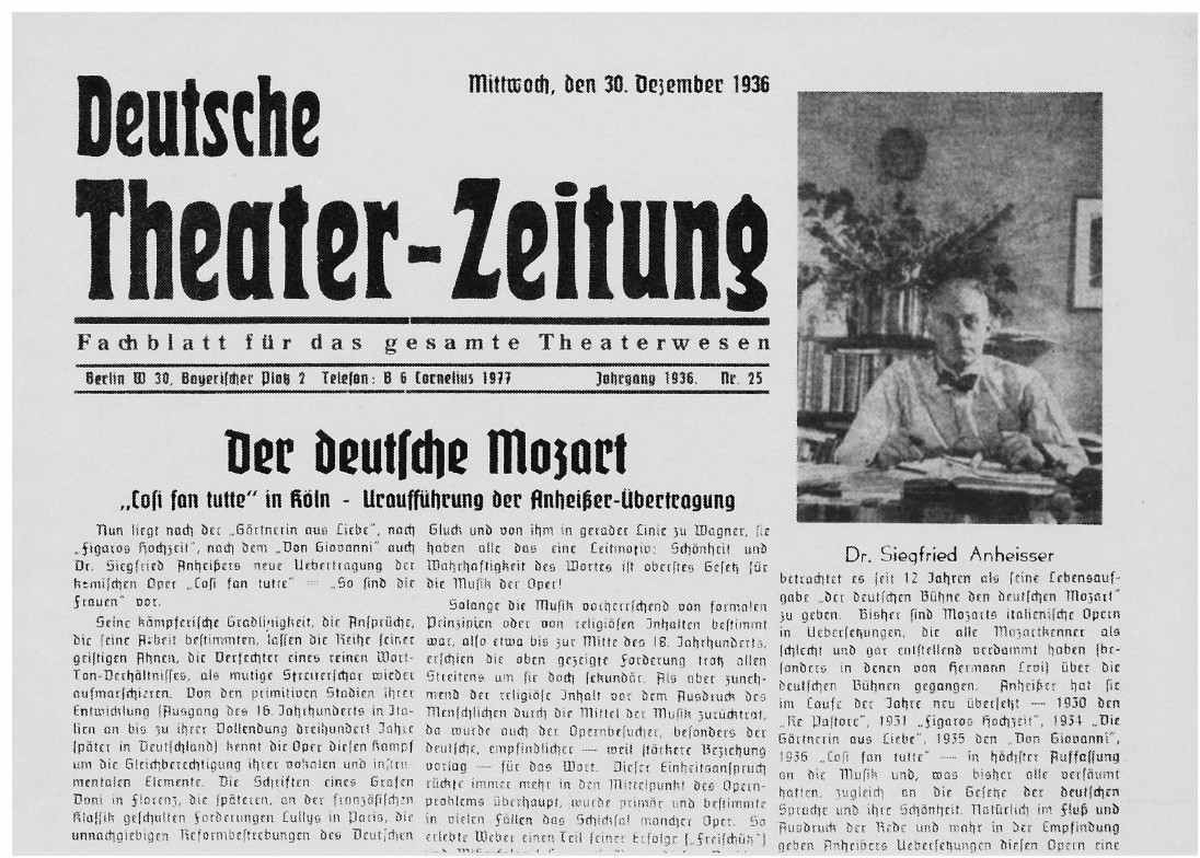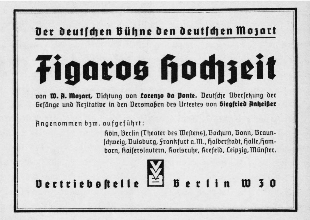 尽管仍有某些剧院残存着不愿放弃已经长期使用的莱维译本的心态,1934年至1938年出版的演出统计和诸多广告显示,安海瑟尔和NSKG已基本上成功地说服德国的许多歌剧院使用他的译本。例如,到1935年12月,安海瑟尔版《费加罗的婚礼》已在科隆、柏林、波鸿(Bochum)、波恩、不伦瑞克、杜伊斯堡、法兰克福、哈尔贝尔斯塔特(Halberstadt)、哈雷(Halle)、汉波恩(Hamborn)、凯泽斯劳滕(Kaiserslautern)、克雷费尔德(Krefeld)、莱比锡和明斯特(Münster)上演。[183]此外,根据《为了德国的莫扎特》一书所列的信息,有76个剧院在安海瑟尔于1938年去世前就把他的《唐·乔万尼》加入了常规剧目。[184]然而,尽管形势明显偏向于他,他离完全独霸莫扎特德译本市场可离得很远。派系政治在纳粹德国屡见不鲜,因而其他译者不可避免地会想让德国的歌剧院采用他们的莫扎特译本,而不是他的。