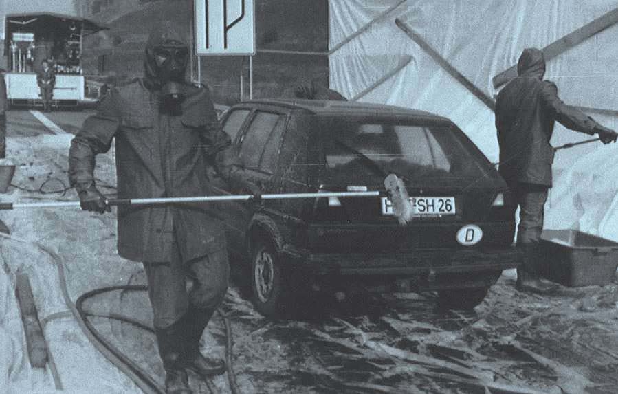 1986年5月3日,在东德边界,人们正在清理一辆由波兰开过来的轿车,它被怀疑已经沾染了辐射粉尘