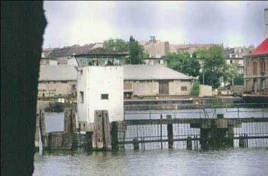 (Spree 河中的柏林墙,东西方的边界划分在两岸中间)
