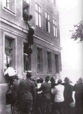 (经过一番努力,东柏林妇女终于由属于东德的楼内进入了属于西德的街道,楼上窗内的为东德警察)