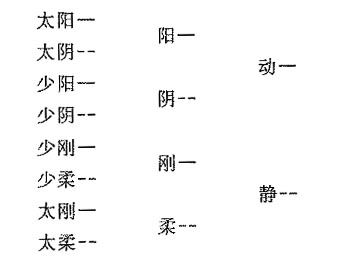 此图有三层,看第二层(即中层)时,须连第一层(即右层)观之。如“阳”右之“一”,合“动”右之“一”为=,此即阳之象也。“阴”右之--合“动”右之“一”为