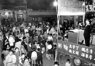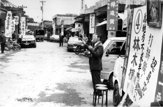 图六 1982年,台湾一位竞选县议员的参选人在街头发表演讲,争取选票。虽然街面上冷冷清清,他也未稍懈怠,毕竟其能否当选,完全取决于选民手中那张选票的投向。